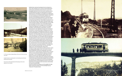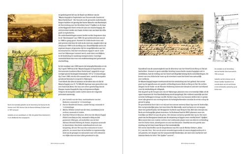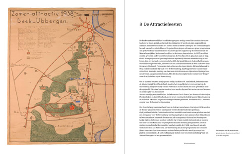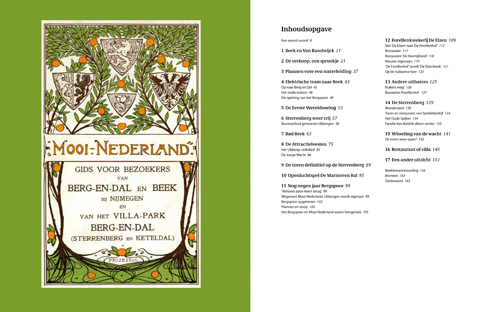 Een eeuw Mooi Nederland / Loet van Sluis. - Ubbergen: Stichting Museum Mooi Nederland, 2011. - gebonden, met stofomslag, 164 p. - rijk geïllustreerd in kleur ISBN 978 90 816944 1 4 Uitverkocht! De band tussen de familie Van Randwijck en het dorp Beek is oud en stamt uit 1660. Eeuwenlang kabbelde de geschiedenis rustig voort totdat begin 20ste eeuw baron Maurits van Randwijck een groot deel van zijn bezittingen, waaronder De Sterrenberg, de aanliggende terreinen en een deel van het dorp Beek verkoopt aan de Haagse exploitatiemaatschappij Mooi Nederland. De Haagse maatschappij heeft als doel er villa’s te bouwen. Het gebied krijgt de naam Villapark Mooi Nederland. Twee Wereldoorlogen en de daartussen liggende crisistijd zorgen ervoor dat deze maatschappij haar doelstelling niet haalt. Andere partijen ontfermen zich over (delen van) het gebied en laten hun sporen in het oude stuk natuur achter. Begin 21ste eeuw: Het boek Een eeuw Mooi Nederland traceert de geschiedenis van Mooi Nederland en documenteert in woord en beeld hoe het met het terrein van Mooi Nederland is verlopen. Via dit boek maakt u een wandeling die begint bij de voorgeschiedenis op het terrein van baron Van Randwijck. U ziet hoe de eerste villa’s werden gebouwd en verkocht, hoe Beek wordt voorzien van waterleiding en tram en hoe Beek het laatste ook weer kwijtraakte (het eerste gelukkig niet). U volgt de opkomst en ondergang van restaurant en uitzichttoren de Sterrenberg, van Bad Beek en de Forellenhof. In de tussentijd maakt u kennis met Wonderland, het openluchttheater met De Marmeren Bal en de Attractiefeesten met het Ubbergs volkslied. Hoewel ze misschien niet onderdeel van de doelstellingen van de oorspronkelijke exploitatiemaatschappij waren, vonden ze toch allemaal plaats op het terrein van Mooi Nederland. Natuurlijk heeft Maatschappij Mooi Nederland wel gebouwd. In eerste instantie bepaalde de maatschappij zélf de regels waaraan de te bouwen objecten moesten voldoen, maar naarmate de gemeente Ubbergen meer invloed kreeg, kon ook zij haar regels toepassen. Het resultaat was echter hetzelfde; langzaam verdween het oude lustoord van de baron en daarmee een fraai stuk natuur en wandelgebied. Gelukkig voor de wandelaars wist de natuurroute N70, zich ondanks alle aanpassingen, te handhaven. Dit alles valt te lezen en vooral ook te zien in deze luxe uitgave van de Stichting Museum Mooi Nederland. Het boek is geschreven door Loet van Sluis, die ook geruime tijd aan onderzoek besteedde. Nog enkele dubbele pagina's uit het boek: