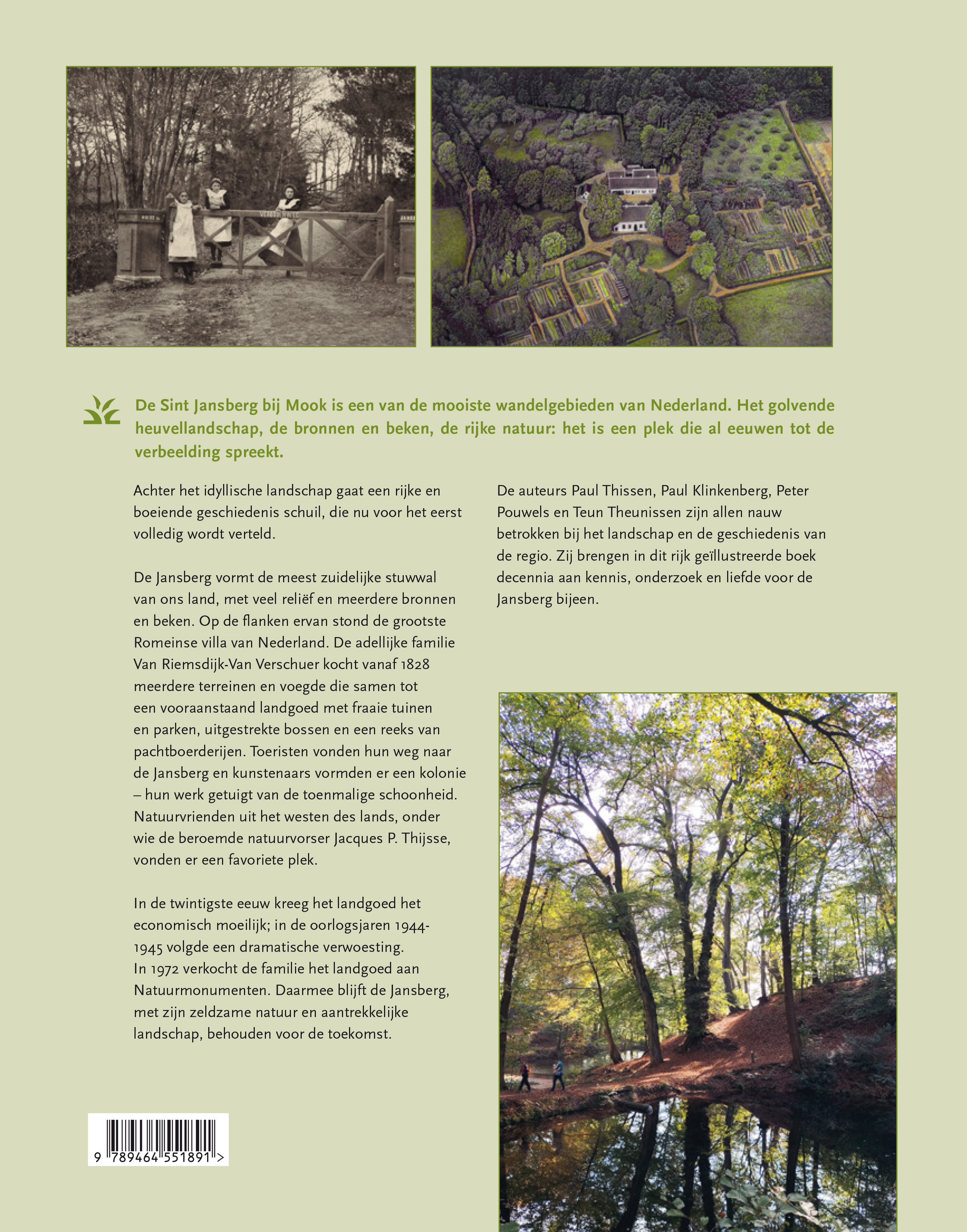 De Sint Jansberg bij Mook is een van de populairste wandelgebieden van Nederland. Niet verwonderlijk, want het is een prachtig heuvelland met een rijke natuur. Weinig mensen kennen echter de rijke en boeiende geschiedenis van de Jansberg. Dit boek brengt daar verandering in. De Jansberg vormt de meest zuidelijke stuwwal van ons land, met veel reliëf en meerdere bronnen en beken. Op de flanken ervan stond de grootste Romeinse villa van Nederland. De adellijke familie Van Riemsdijk-Van Verschuer kocht vanaf 1828 meerdere terreinen en voegde die samen tot een vooraanstaand landgoed met fraaie tuinen en parken, uitgestrekte bossen en een reeks van pachtboerderijen. Toeristen vonden hun weg naar de Jansberg en kunstenaars vormden er een kolonie – hun werk getuigt van de toenmalige schoonheid. Natuurvrienden uit het westen des lands, onder wie de beroemde natuurvorser Jacques P. Thijsse, vonden er een favoriete plek. Na enige neergang in de twintigste eeuw volgde een dramatische verwoesting in de oorlogsjaren 1944-1945. In 1972 verkocht de familie het landgoed aan Natuurmonumenten, in de wetenschap dat de Jansberg zo behouden zou blijven met de zeldzame natuur en het aantrekkelijke landschap. Dankzij het aanboren van nieuwe bronnen en de ontdekking van nog nooit gepubliceerde afbeeldingen geeft dit boek voor het eerst in woord en beeld een compleet, levendig en persoonlijk beeld van het landgoed de Sint Jansberg.
